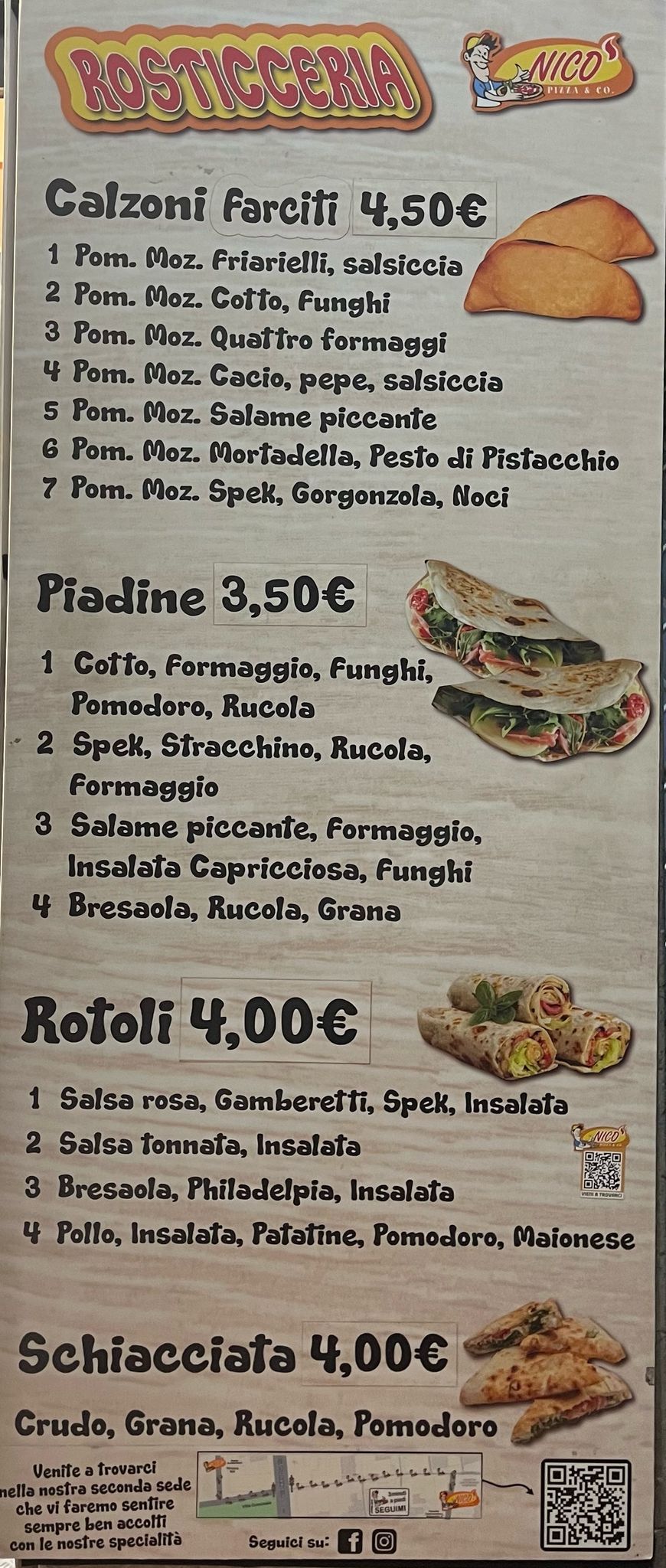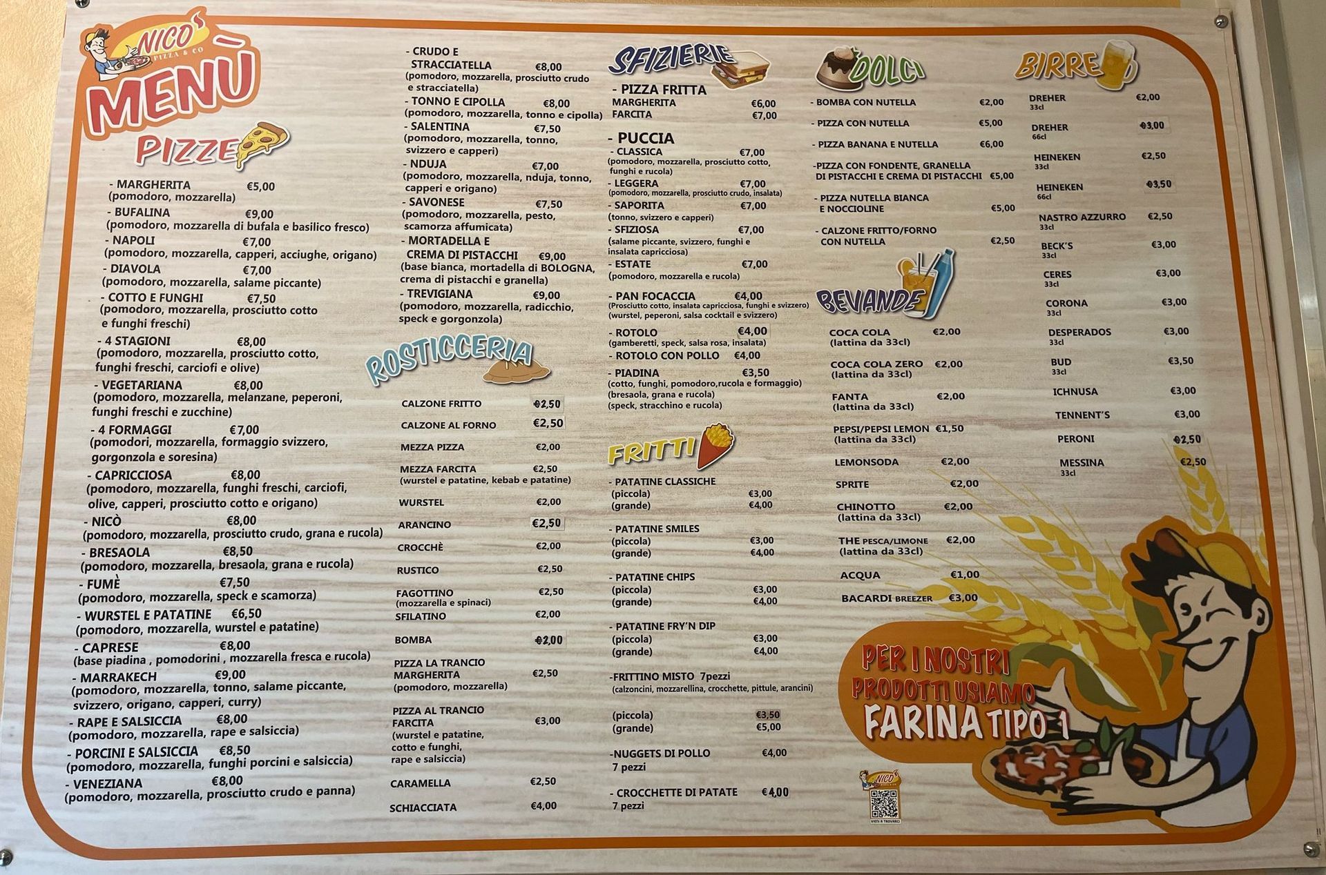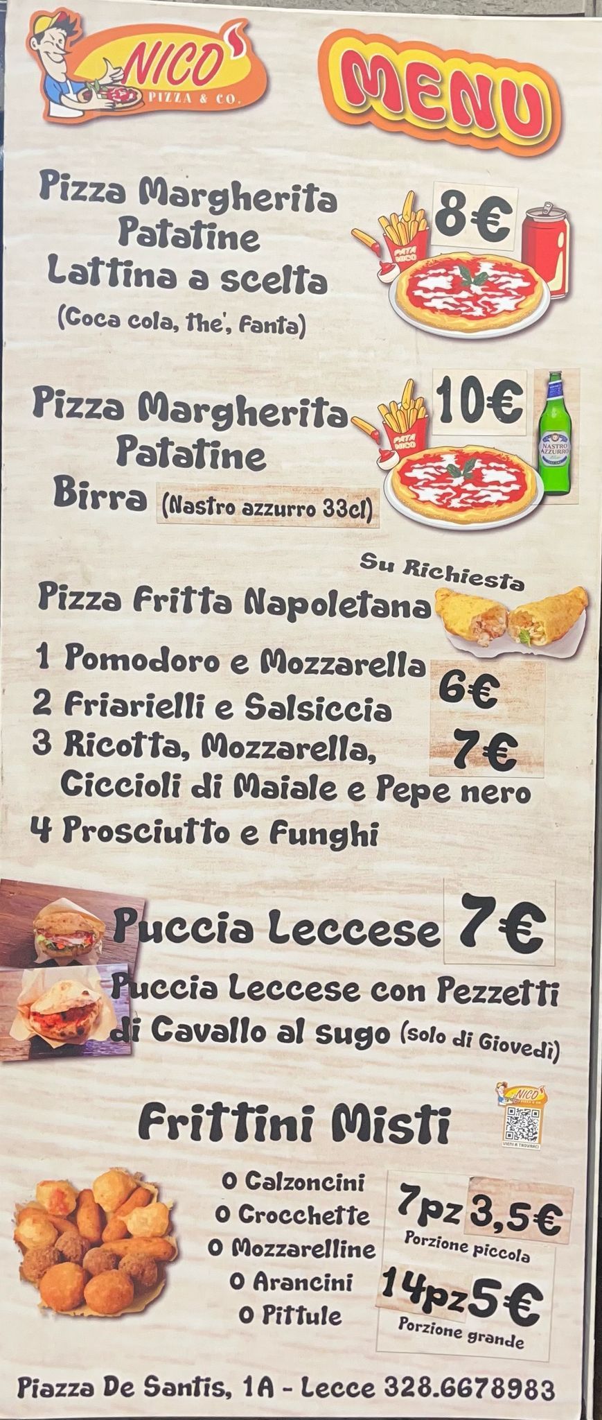 Il menu di Nicò Pizza & Co. è un omaggio alla tradizione gastronomica salentina. Offriamo una vasta selezione di pizze classiche, preparate con impasti lievitati lentamente usando farina tipo 1, e specialità di rosticceria come il rustico leccese, il calzone, la bomba fritta e il nostro arancino artigianale. Ogni piatto è realizzato con ingredienti freschi e genuini per garantire una qualità senza compromessi, perché il nostro obiettivo è offrire sapori autentici che ti fanno sentire a casa. Scegli tra le nostre delizie e lasciati conquistare dalla vera cucina salentina!